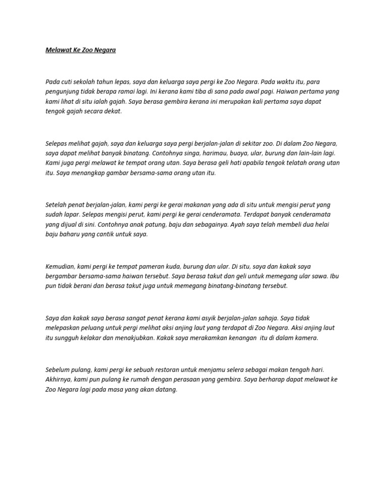 Pada waktu petang bapa juga membeli makan untuk kami. Kami bertolak dari sekolah pada jam 9 00 pagi dan sampai di zoo negara pada pukul 1. Kami bertolak pada pukul 6 00 pagi dengan menaiki sebuah bas yang disewa khas. Contoh karangan keperihalan upsr melawat ke zoo negara pada cuti penggal sekolah yang lepas guru darjah kami telah mengadakan rombongan lawatan ke zoo negara.