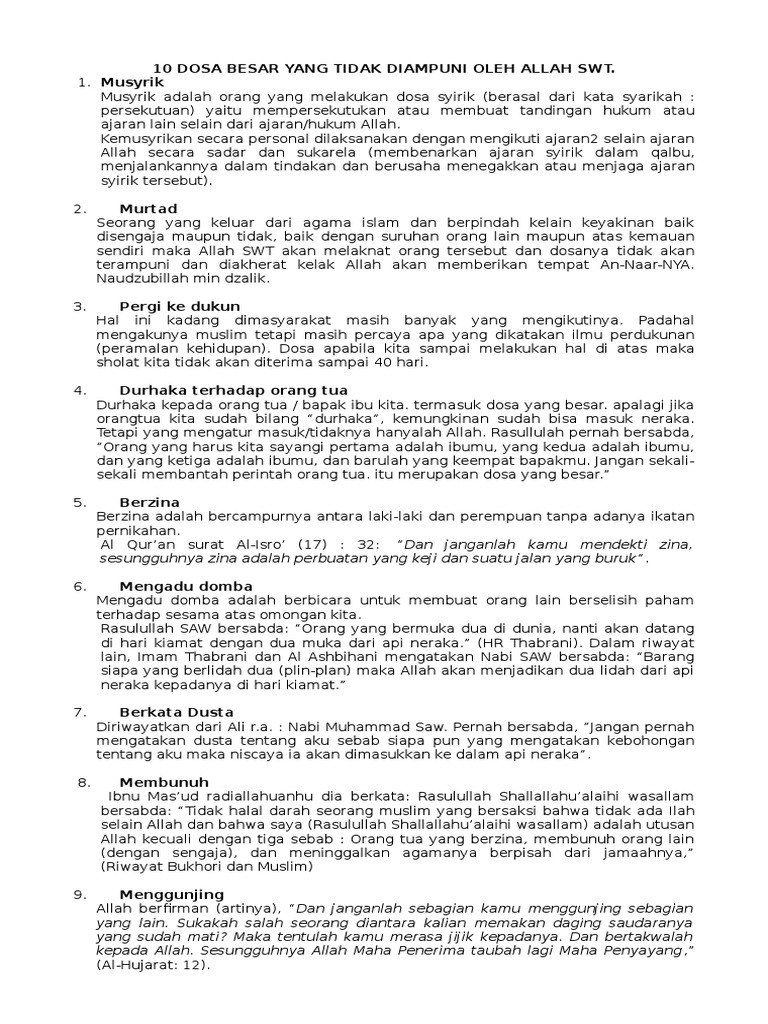10 Dosa Besar Yang Tidak Diampuni Oleh Allah Swt
