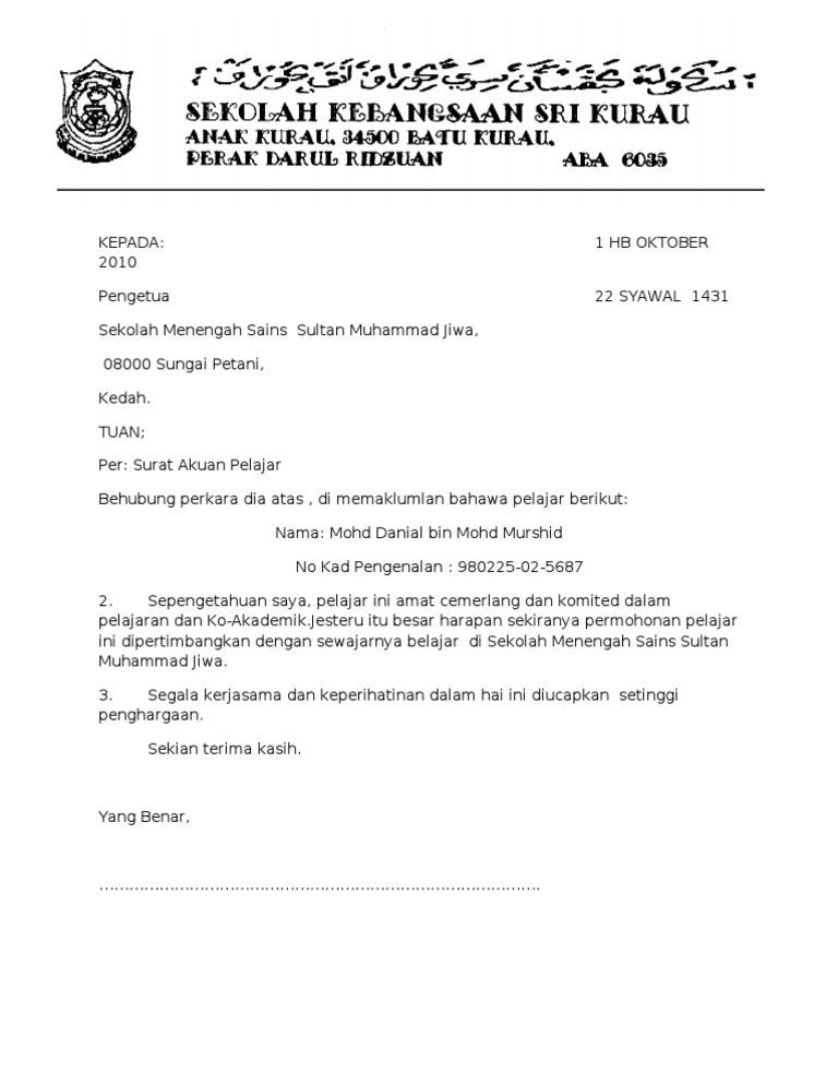 Contoh Surat Pengesahan Pelajar